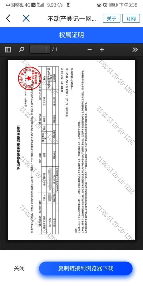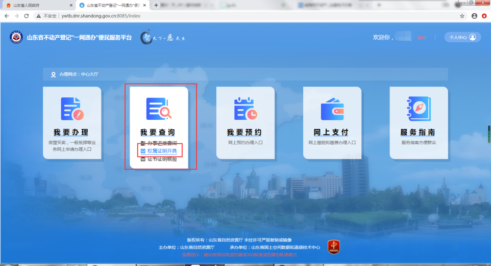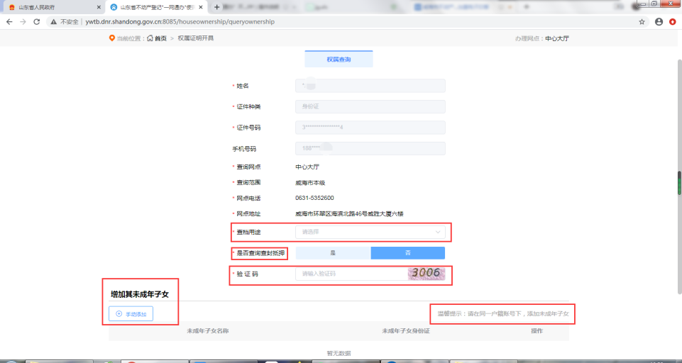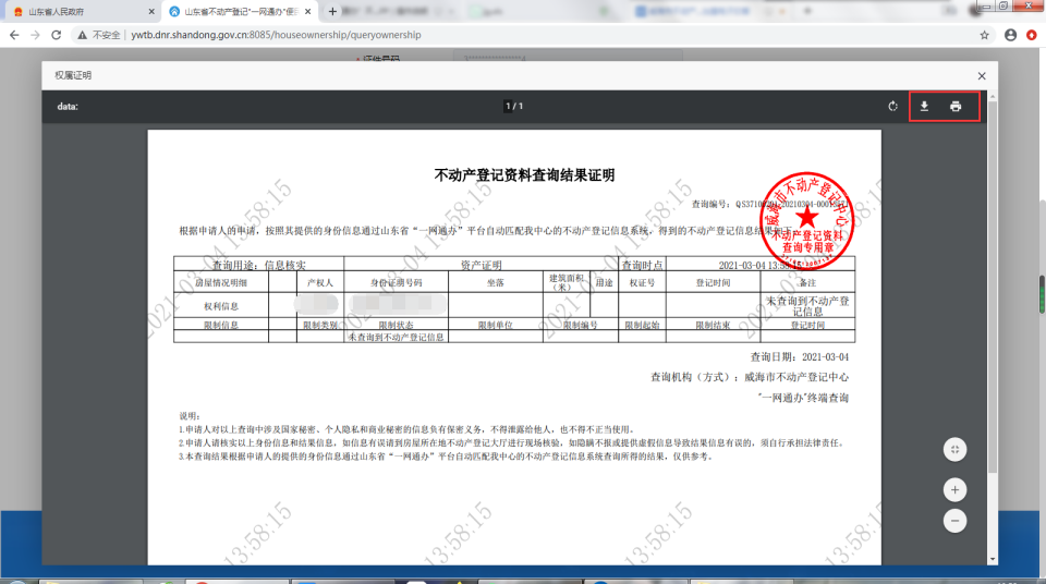 为优化不动产登记营商环境,满足群众异地网上查询不动产登记信息等服务需求,近日,全市各不动产登记机构完成了不动产登记网上查询功能升级改造,将“加盖查询章”功能嵌入本地登记系统,实现电脑端服务平台和手机端“爱山东”查询结果自动加盖电子印章。申请人只需登录威海市政务服务网或“爱山东APP”,进入不动产登记‘一网通办’便民服务平台”,选择拟查询区域,点击“开具权属证明”选项,阅读并同意“查询须知”,选择“查档用途”,输入验证码点击“查询”后,系统将会自动生成加盖电子印章的权属证明(PDF格式)。申请人可自行打印或下载使用。带有查询电子印章的网上查询记录与线下不动产登记中心开具的权属证明具有同等法律效力,实现群众查询不动产登记信息网上办、掌上办、即时办、异地办。 具体查询方法如下: 电脑端: 1. 通过山东政务服务网进入“一网通办”平台,政务网址:http://www.shandong.gov.cn/index.html 2. 选择相应大厅后,进入首页,点击我要查询——权属证明开具; 3.选择查档用途; 4.填写验证码; 5.如有未成年子女可在左侧点击手动添加; 6.点击查询,生成PDF证明文件; 7.点击查看下载PDF,可预览查询结果证明; 查询结果可在右上角点击下载、打印: 手机端: 1.进入“爱山东”app选择右上角不动产登记一网通办; 2.选择办理区域,威海市——环翠区——各分中心; 3.进入主页,选择开具权属证明; 4.选择查档用途,选择是否查询限制信息; 5.输入验证码,如有未成年子女可选择手动添加,点击查询; 6.点击查看pdf,生成权属证明,可点击复制链接至浏览器下; | ||||