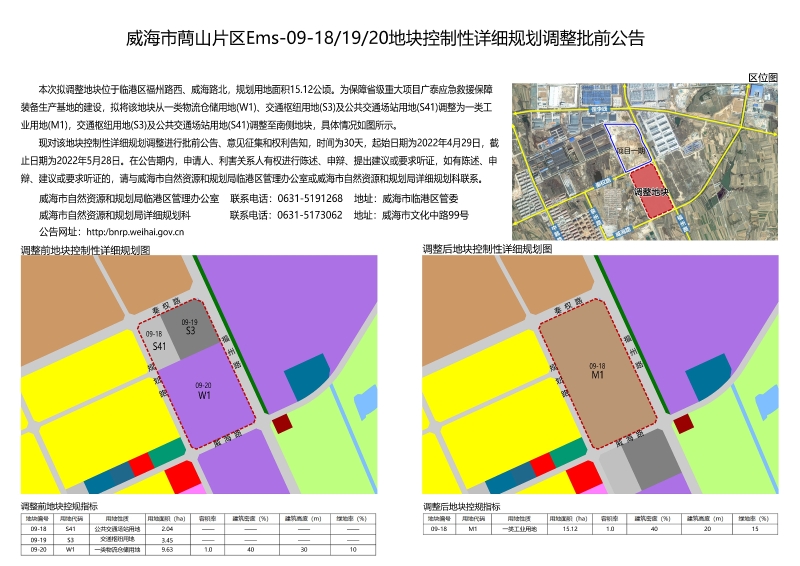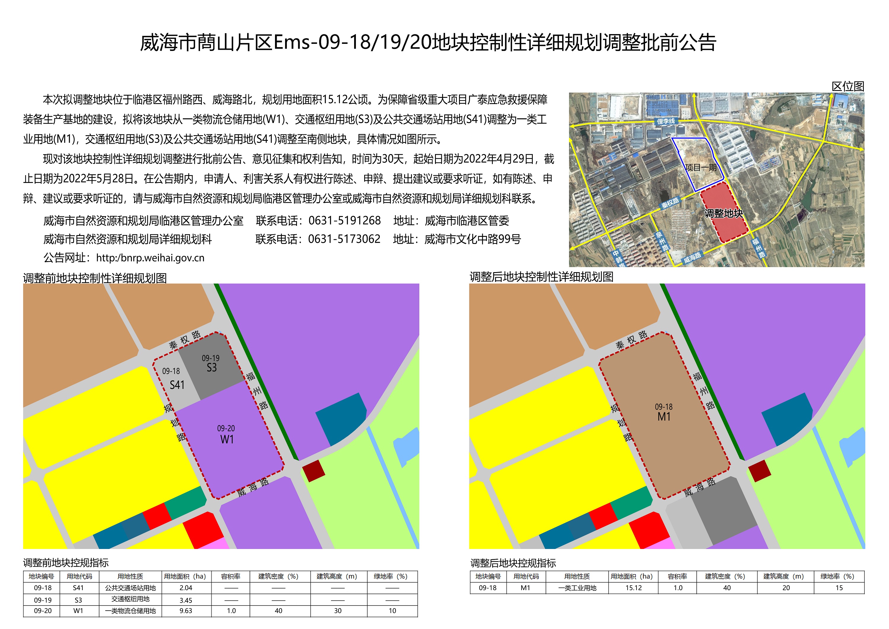 威海市蔄山片区Ems-09-18/19/20地块控制性详细规划调整批前公告