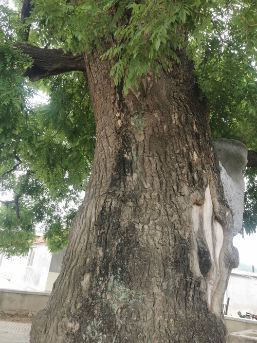 历史:据该村老人讲,相传在1910年间,孙中山领导驱逐大掳(清朝满族统治),恢复中华,创立民国,平均地权的斗争(称杀达子)中,古老国槐树被火烧损伤,致使3米以下东西两面剥蚀,中部腐朽,因年复一年天长日久,南部和北部各自向内愈合,形成两圆柱状枝,像两条腿在站立支撑,托着年迈的老人向人们诉说着历史的沧桑。古树上生有4个大主枝,主枝上新枝峥嵘,像枯木逢春,果实累累,奇特古雅。更有趣的是,在树高3.2米处有一个向西枯落枝的基痕,每当阴天下雨之前必定要向下滴水。村民们说,这里是最准的天气预报,能否下雨只要看树上滴不滴水就知道了。