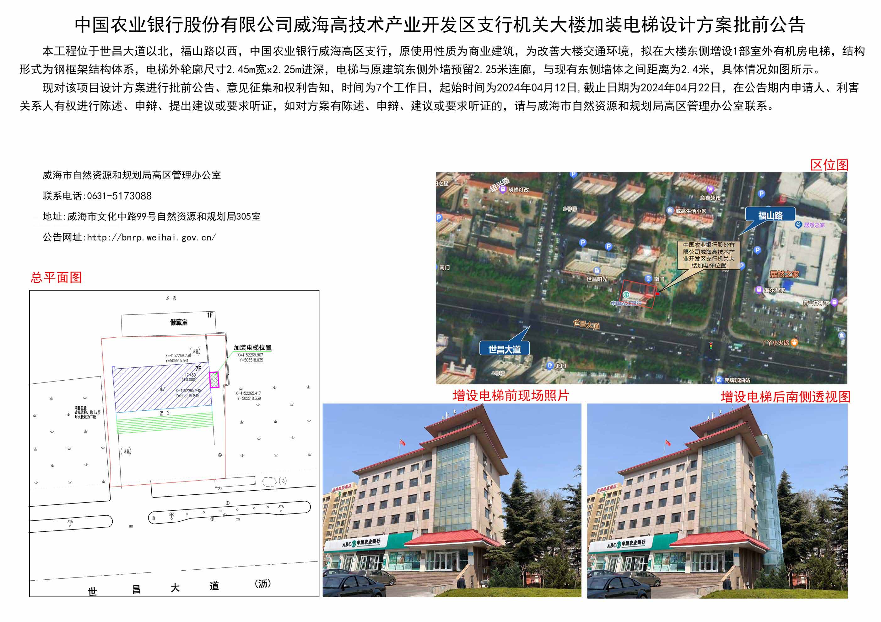中国农业银行股份有限公司威海高技术产业开发区支行机关大楼加装电梯设计方案批前公告