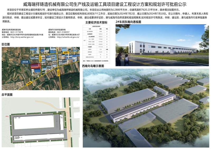 威海瑞祥铸造机械有限公司生产线及运输工具项目建设工程设计方案和规划许可批前公示