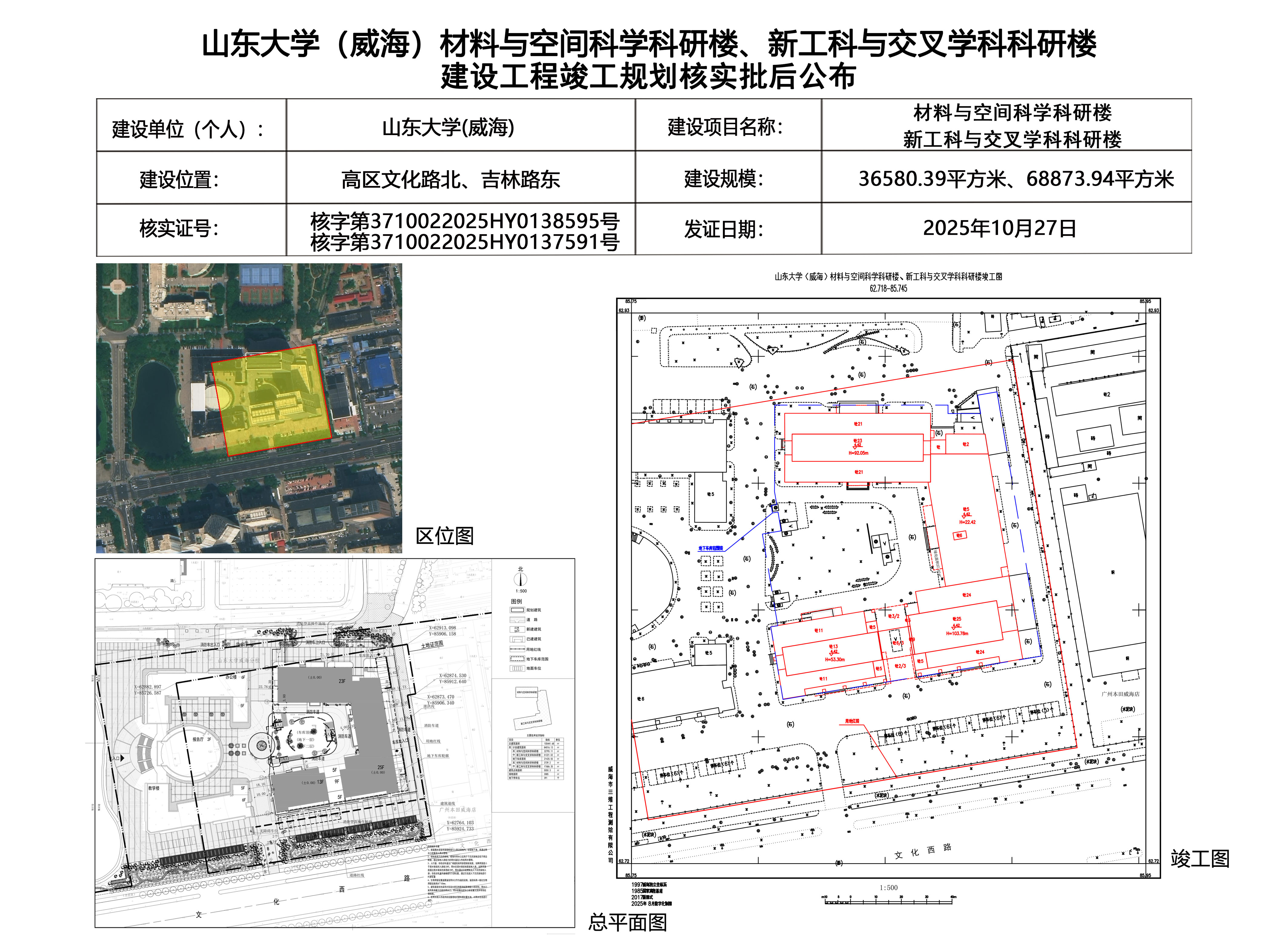 山东大学(威海)材料与空间科学科研楼、新工科与交叉学科科研楼建设工程竣工规划核实批后公布