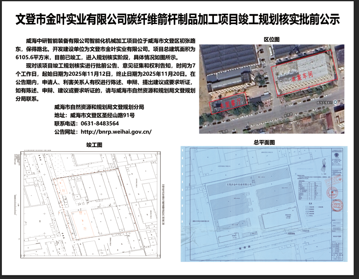 文登金叶实业有限公司碳纤维箭杆制品加工项目竣工规划核实批前公示