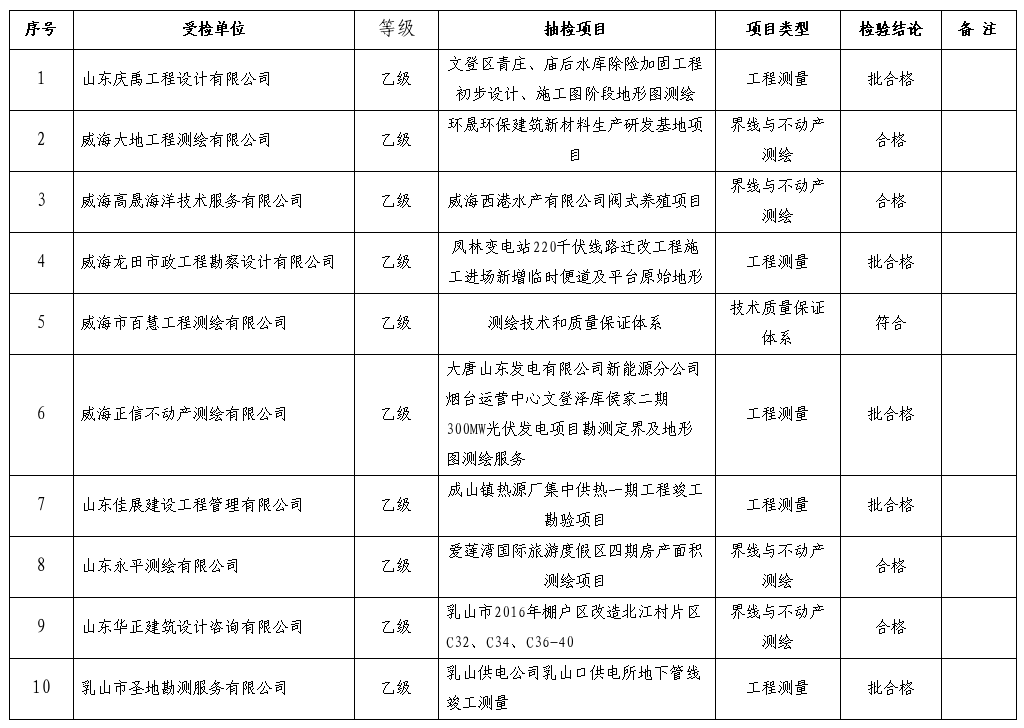 为进一步加强测绘地理信息行业监督管理,全面提升测绘地理信息成果质量和测绘资质单位服务水平,依据《中华人民共和国测绘法》《山东省测绘地理信息条例》《测绘地理信息质量管理办法》等有关规定,威海市自然资源和规划局联合威海市市场监督管理局按照“双随机、一公开”的要求,确定受检单位,并自2025年7月起至10月,组织开展了测绘资质和测绘地理信息成果质量两项内容的年度监督检查工作。现将结果公告如下: 一、测绘资质监督检查 检查组对10家乙级测绘资质单位,进行了测绘资质监督检查,结果均为符合(详见附件1)。 二、测绘地理信息成果质量监督检查 检查组对10家乙级测绘资质单位,进行了测绘地理信息成果质量监督检查,受检单位的成果质量均达到合格标准(详见附件2)。 特此公告。 附件:1.2025年测绘资质监督检查结果一览表 2.2025年测绘地理信息成果质量监督检查结果一览表 威海市自然资源和规划局 2025年11月17日 附件1 2025年测绘资质监督检查结果一览表