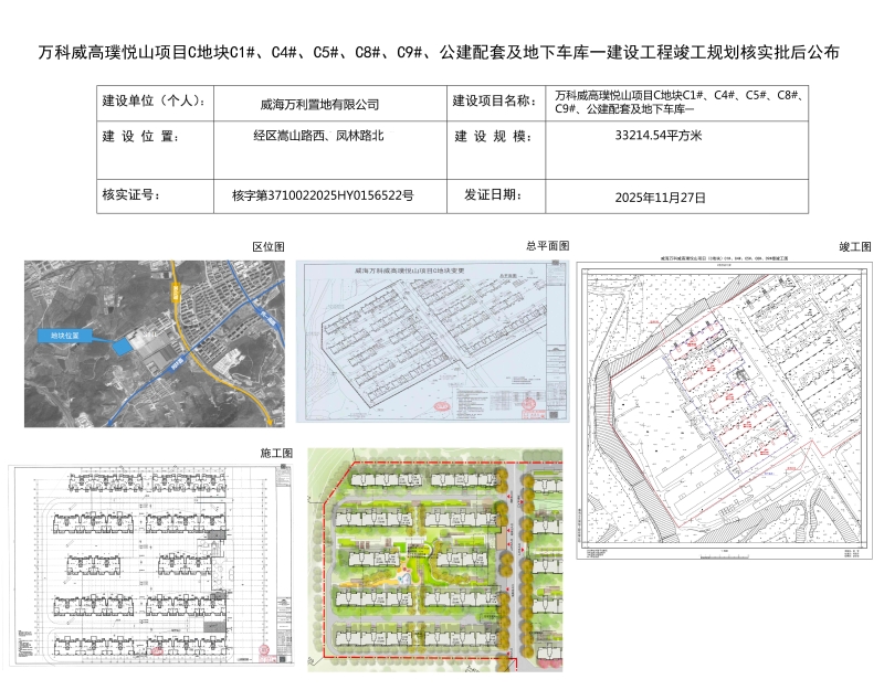 万科威高璞悦山项目C地块C1#、C4#、C5#、C8#、C9#、公建配套及地下车库一建设工程竣工规划核实批后公布