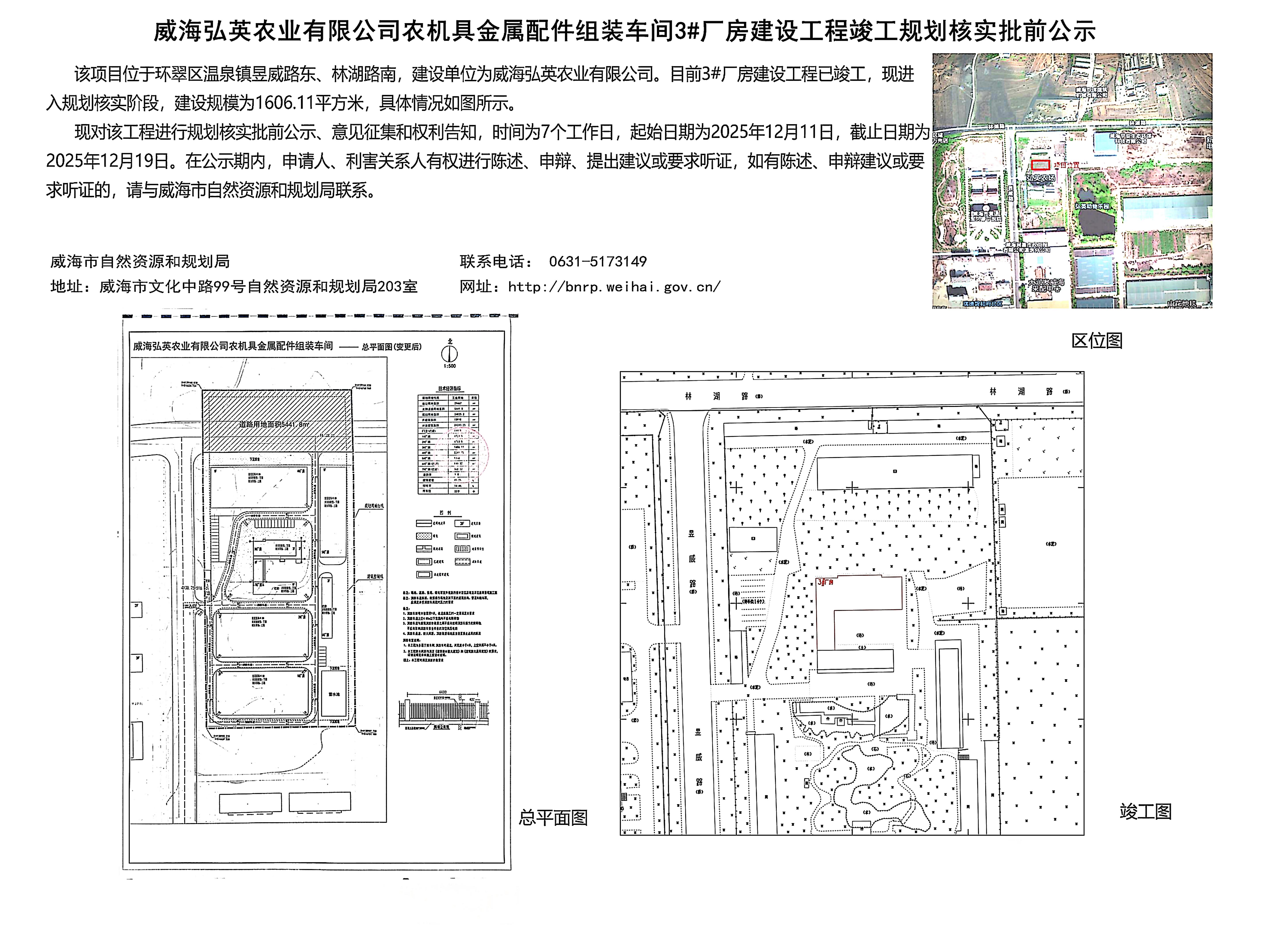 威海弘英农业有限公司农机具金属配件组装车间3#厂房建设工程竣工规划核实批前公示