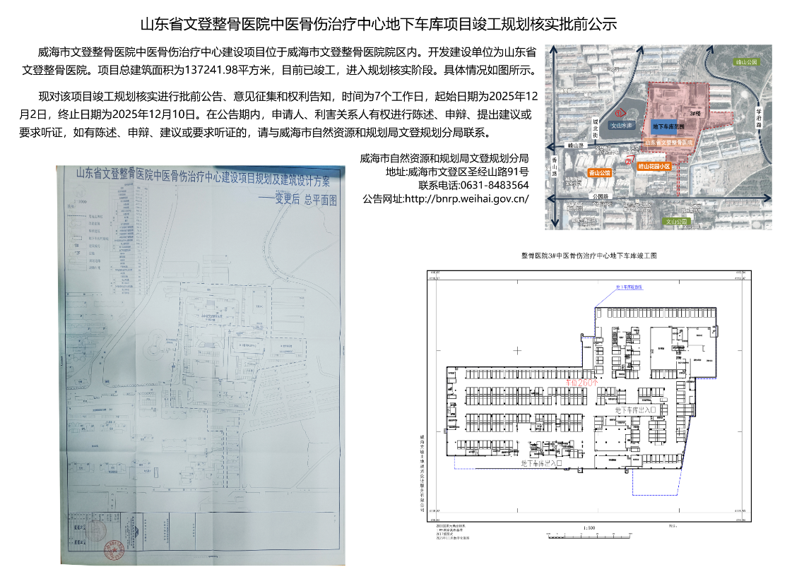 山东省文登整骨医院中医骨伤治疗中心地下车库项目竣工规划核实批前公示