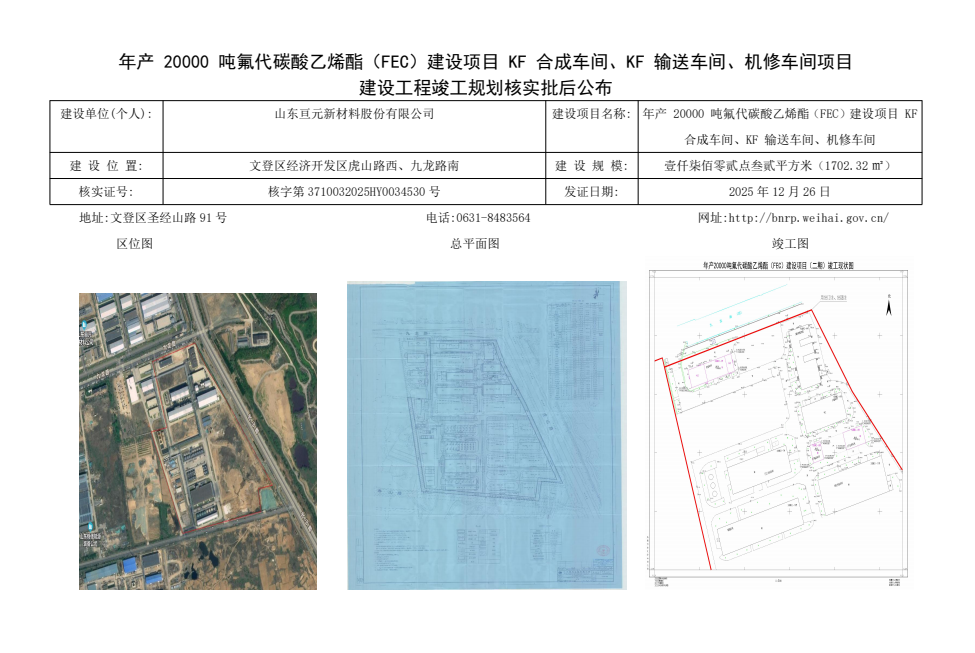 年产 20000 吨氟代碳酸乙烯酯(FEC)建设项目 KF 合成车间、KF 输送车间、机修车间项目建设工程竣工规划核实批后公布