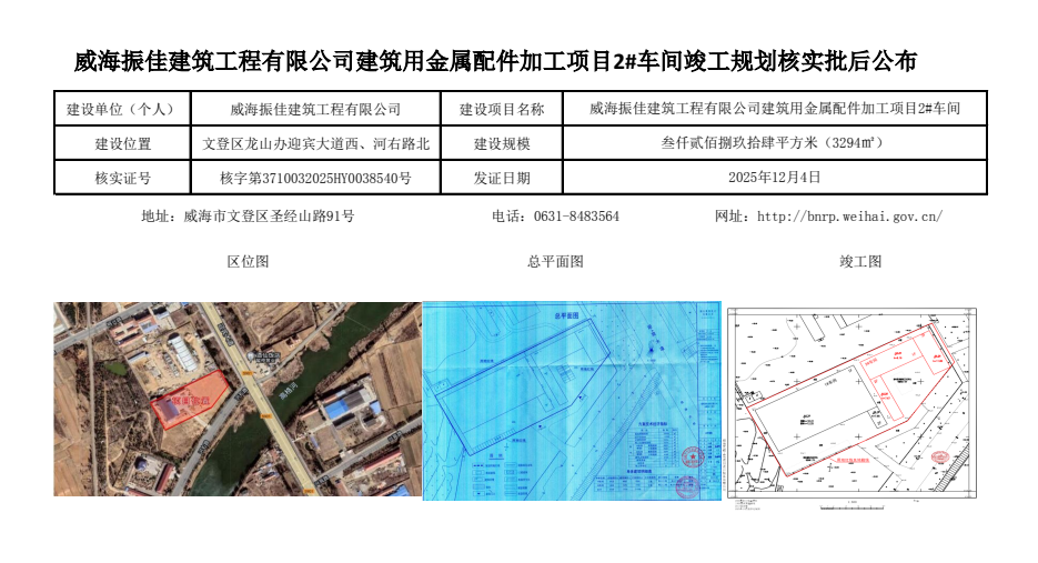 威海振佳建筑工程有限公司建筑用金属配件加工项目2#车间竣工规划核实批后公布