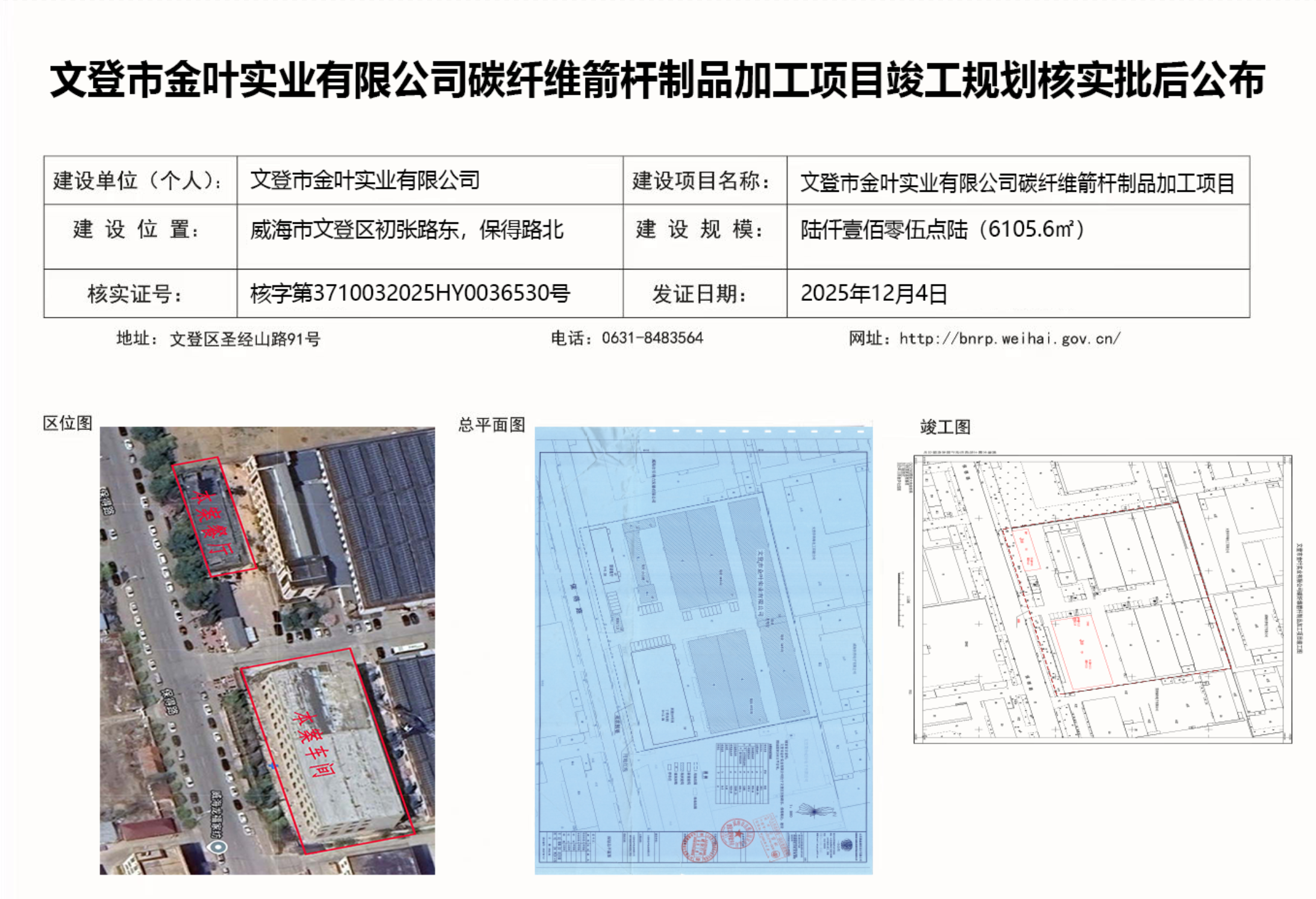 文登市金叶实业有限公司碳纤维箭杆制品加工项目竣工规划核实批后公布