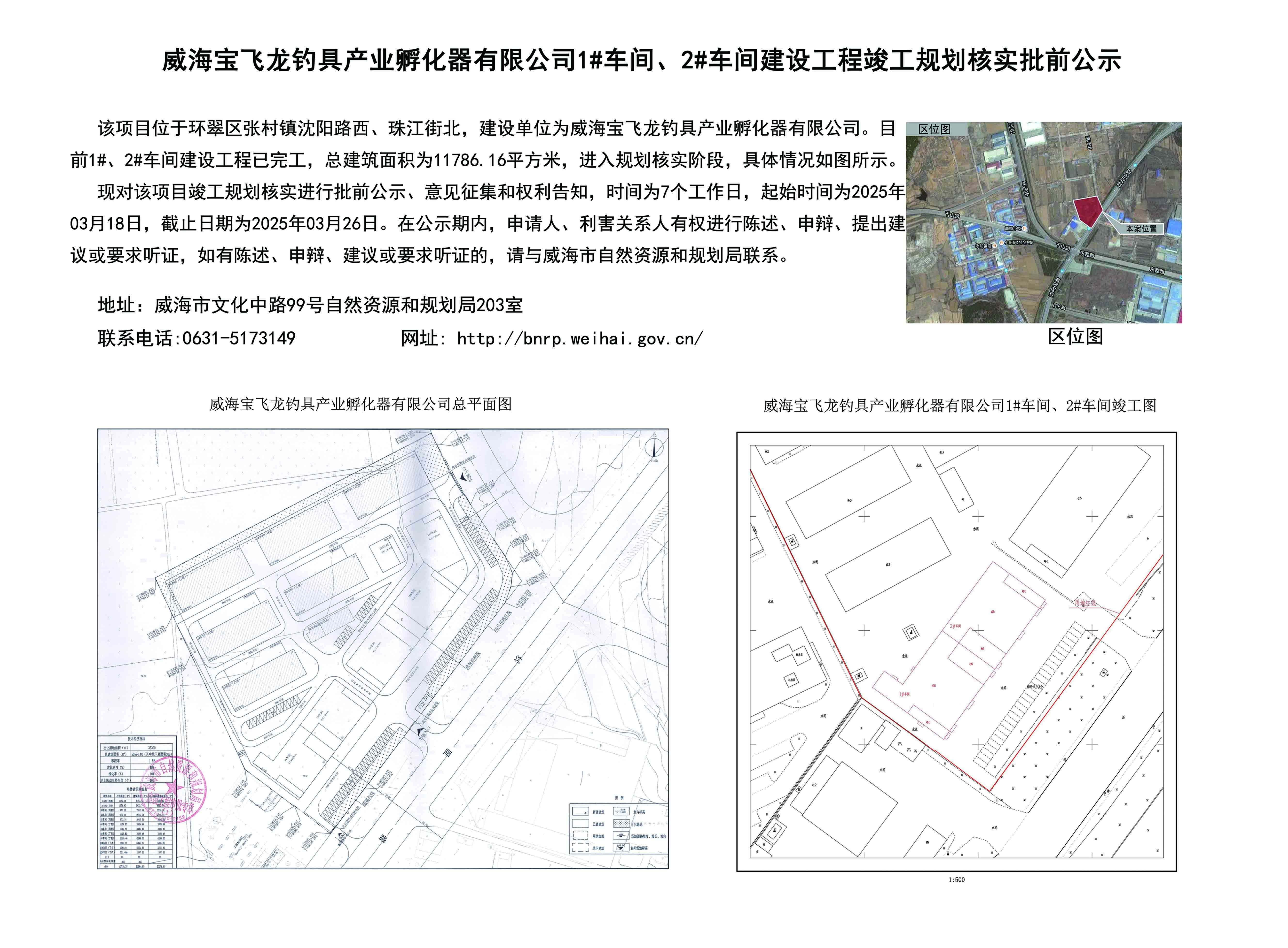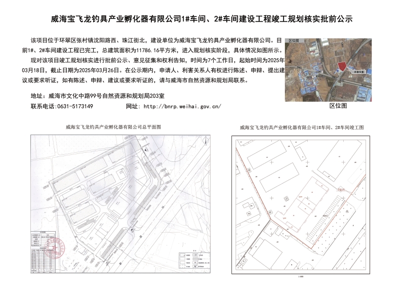 威海宝飞龙钓具产业孵化器有限公司1#车间、2#车间建设工程竣工规划核实批前公示