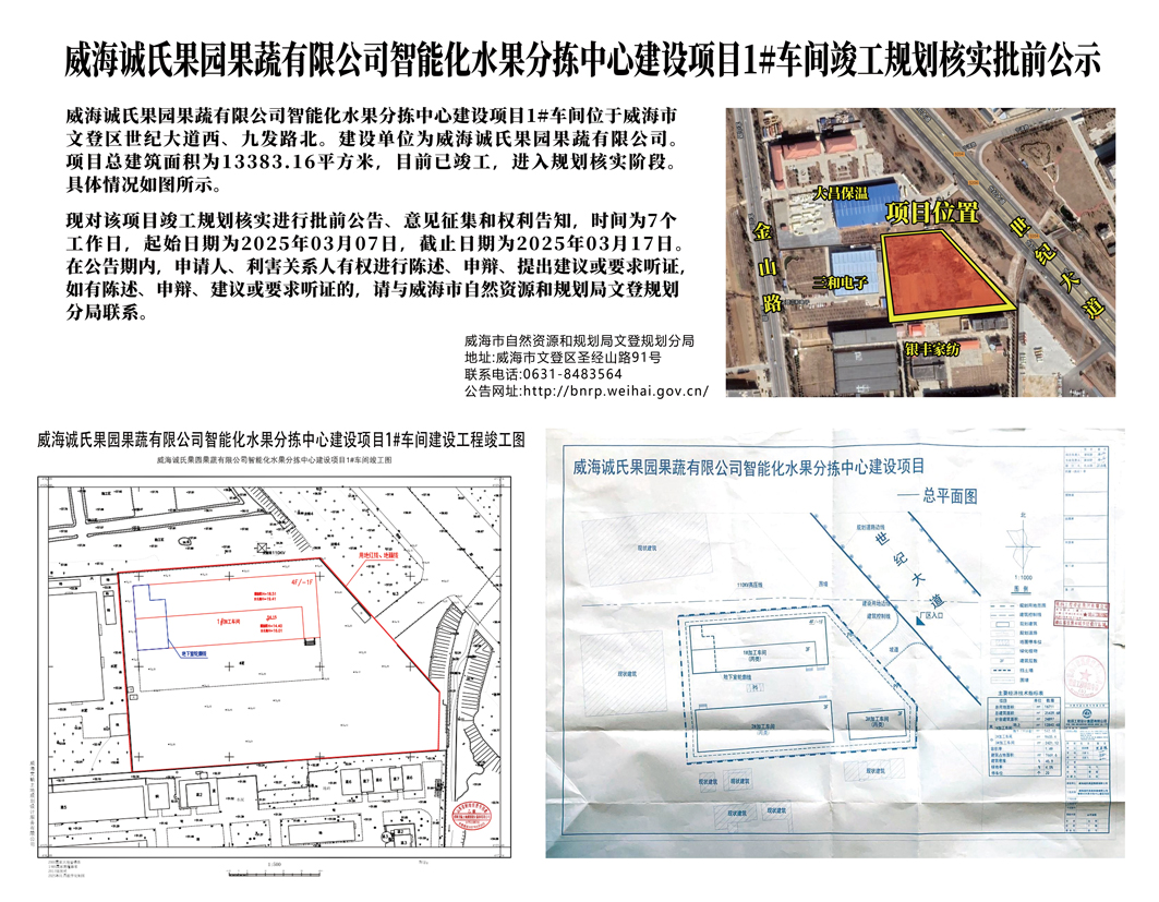 威海诚氏果园果蔬有限公司智能化水果分拣中心建设项目1#车间竣工规划核实批前公示