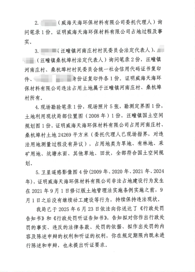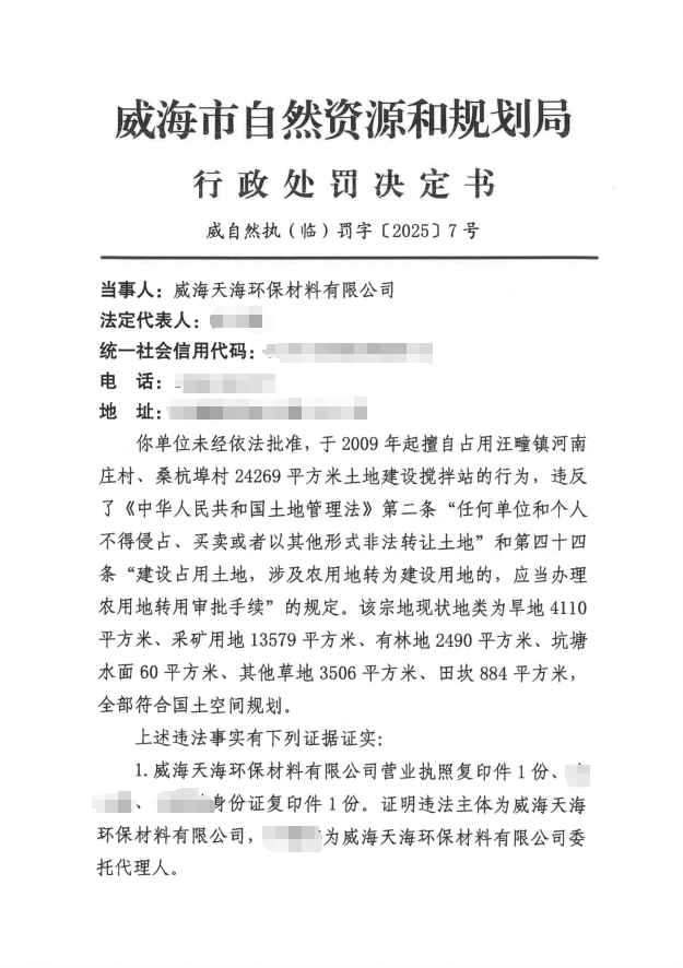 威海天海环保材料有限公司行政处罚决定书