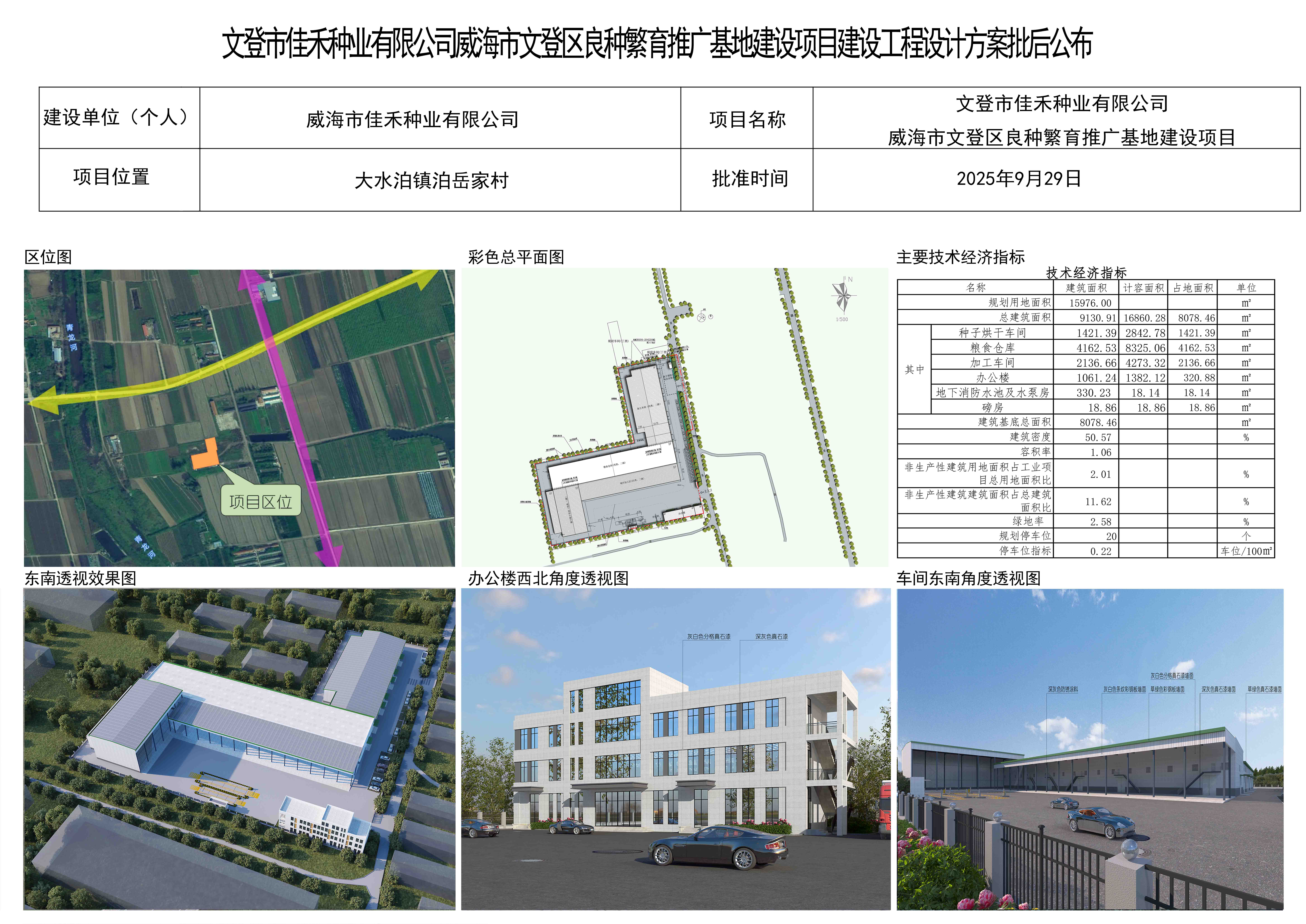 文登市佳禾种业有限公司威海市文登区良种繁育推广基地建设项目建设工程设计方案批后公布