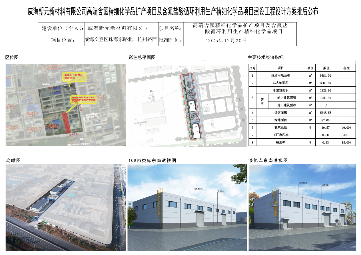 威海新元新材料有限公司高端含氟精细化学品扩产项目及含氟盐酸循环利用生产精细化学品项目建设工程设计方案批后公布