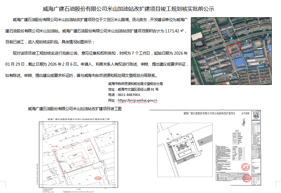 威海广建石油股份有限公司米山加油站改扩建项目竣工规划核实批前公示