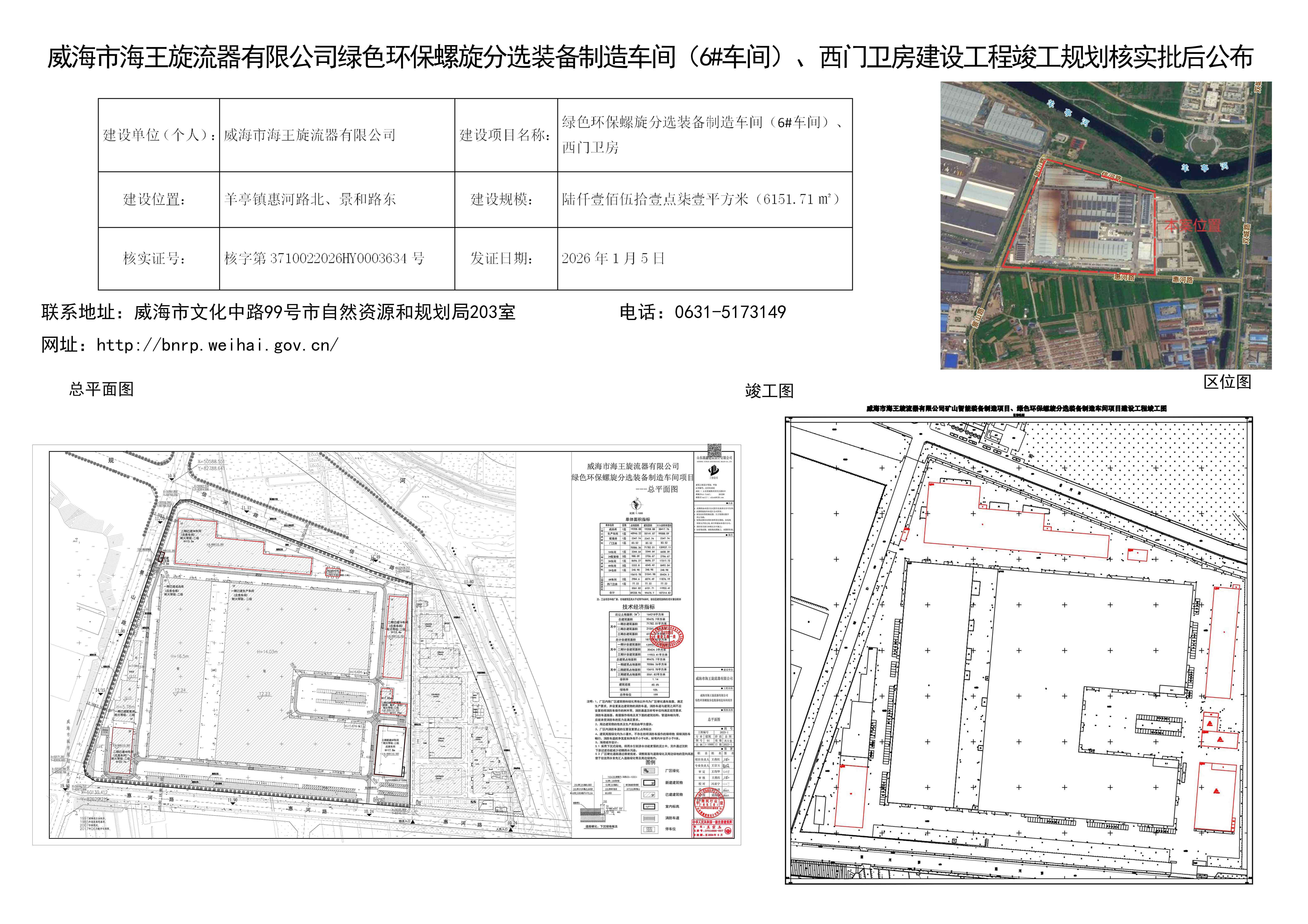 威海市海王旋流器有限公司绿色环保螺旋分选装备制造车间(6#车间)、西门卫房建设工程竣工规划核实批后公布