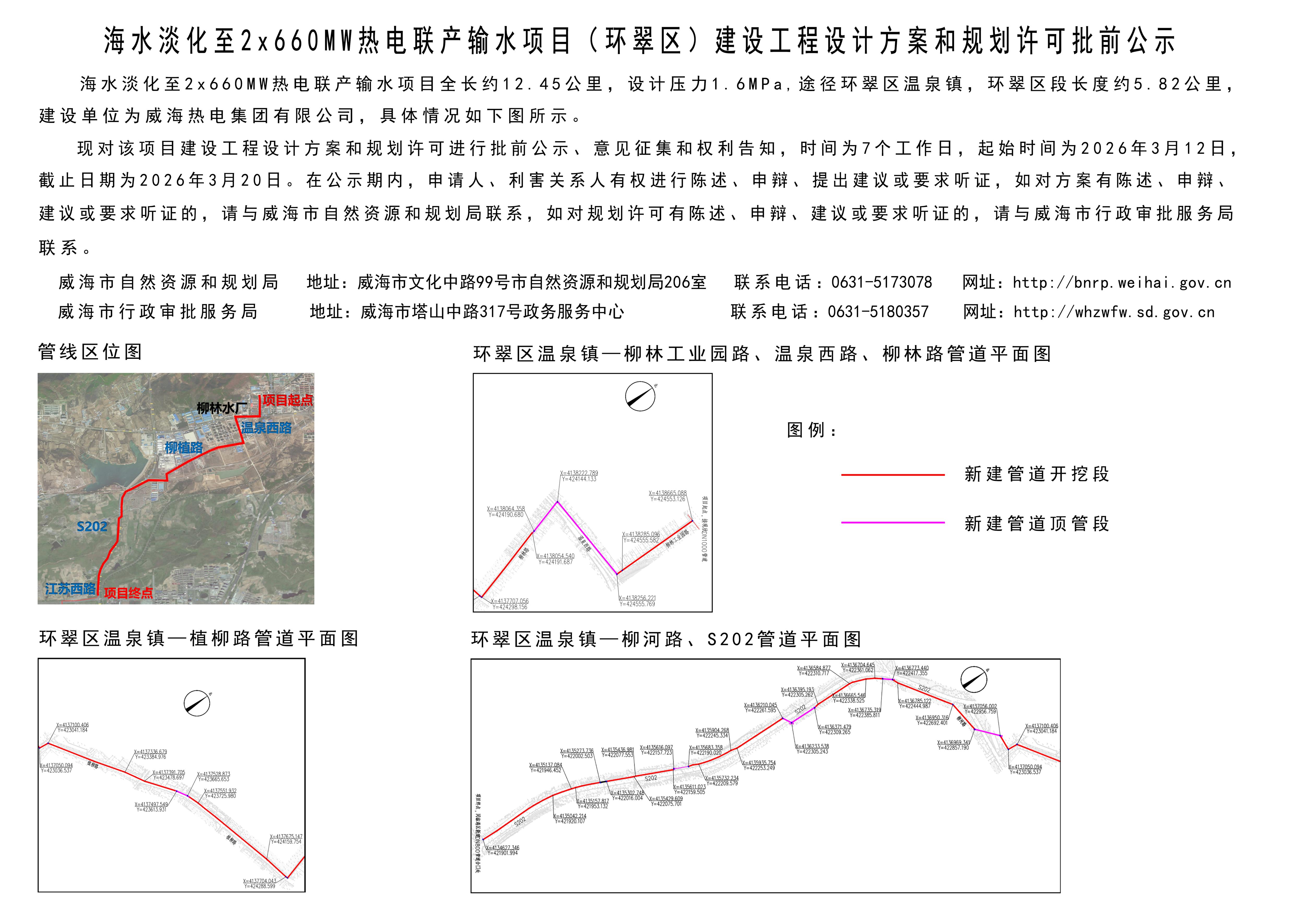 海水淡化至2×660MW热电联产输水项目(环翠区)建设工程设计方案和规划许可批前公示