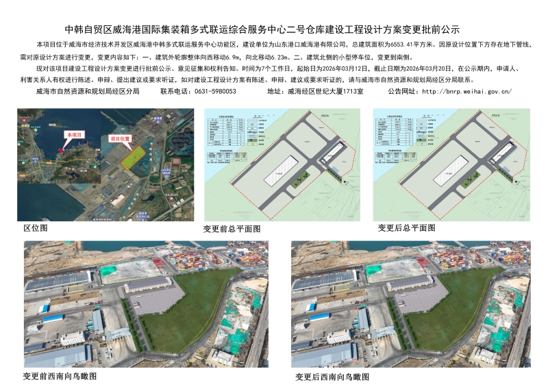 中韩自贸区威海港国际集装箱多式联运综合服务中心二号仓库建设工程设计方案变更批前公示