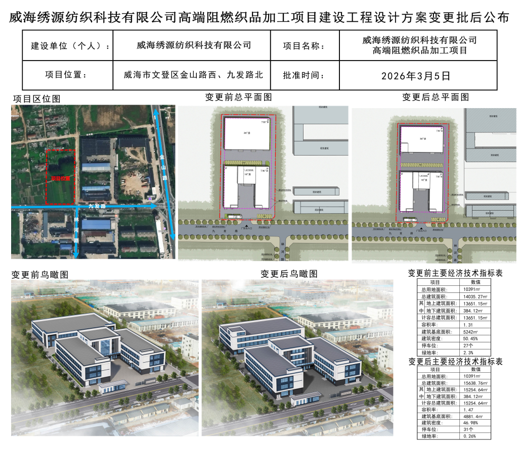 威海绣源纺织科技有限公司高端阻燃织品加工项目建设工程设计方案变更批后公布