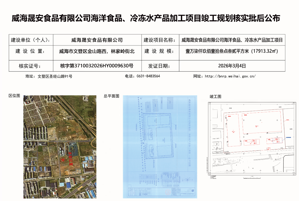 威海晟安食品有限公司海洋食品、冷冻水产品加工项目竣工规划核实批后公布