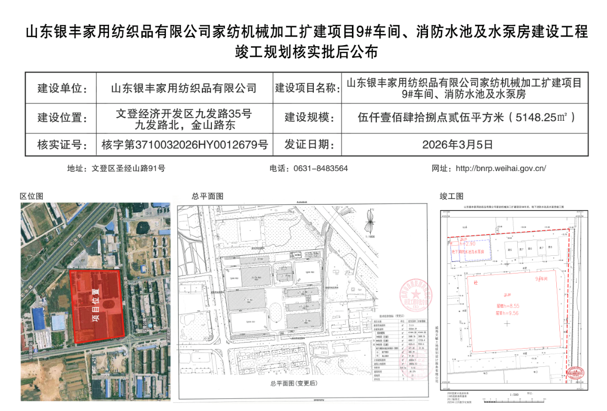 山东银丰家用纺织品有限公司家纺机械加工扩建项目9#车间、消防水池及水泵房建设工程竣工规划核实批后公布