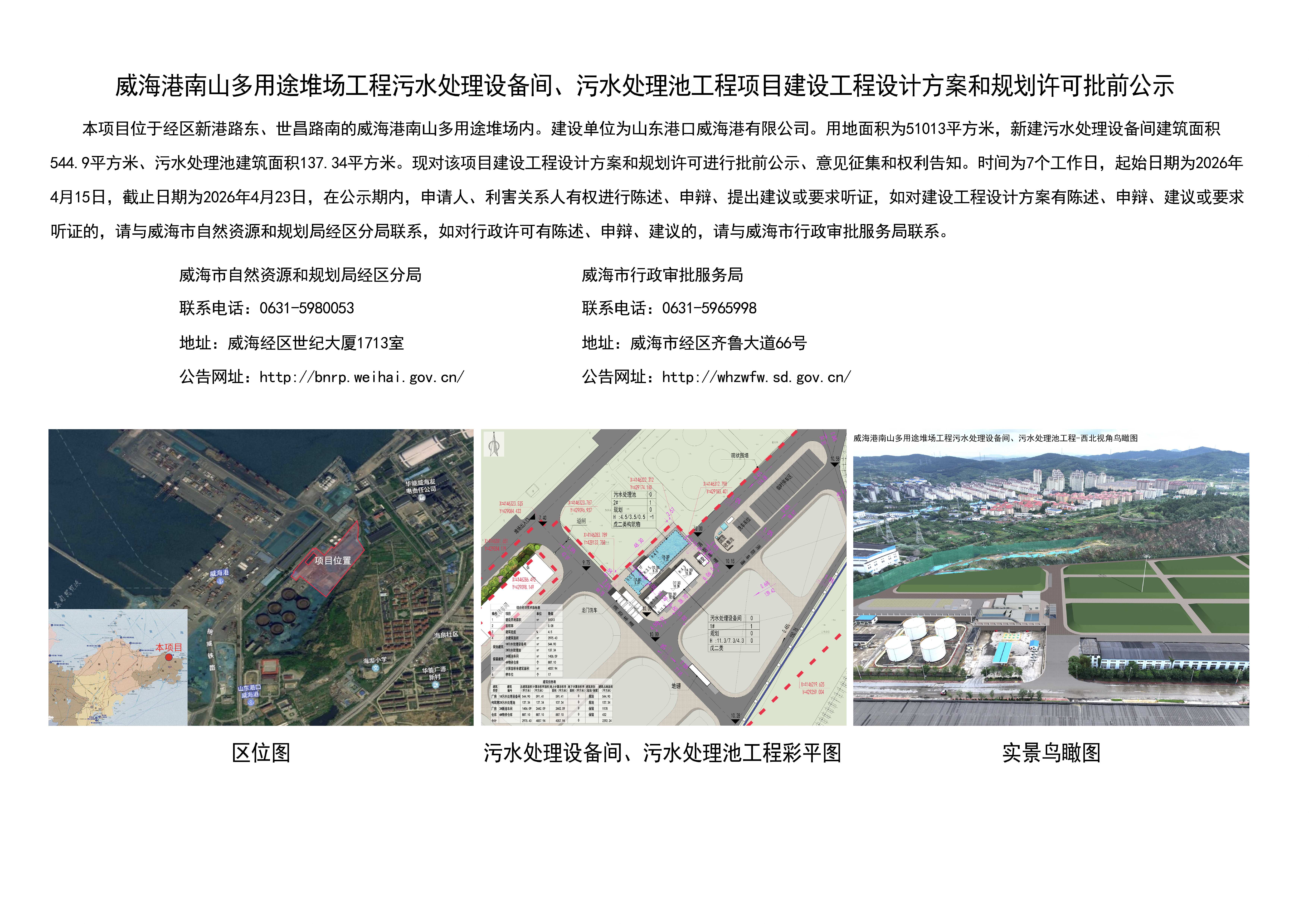 威海港南山多用途堆场工程污水处理设备间、污水处理池工程项目建设工程设计方案和规划许可批前公示