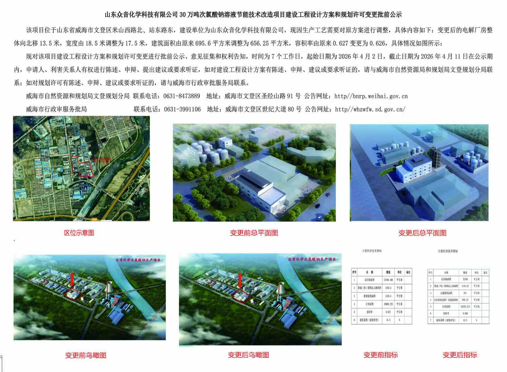 山东众音化学科技有限公司30万吨次氯酸钠溶液节能技术改造项目建设工程设计方案和规划许可变更批前公示